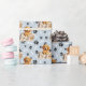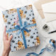 Un adorable chiot Golden Retriever jetant un oeil dans un panier en osier est la caractéristique du motif sur ce papier cadeau d'emballage toutes occasions. Le portrait se trouve au milieu d'un motif d'empreintes de pattes noirs et d'os blancs, et est répété sur un arrière - plan bleu argenté. Parfait pour tout Amoureux des chiens Golden Retriever !