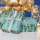 Beau papier d'emballage rétro aux cloches bleues et turquoise, orné d'un joli ruban blanc accroché aux branches des arbres de Noël.