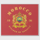 Les armoiries nationales du Maroc sont centrées entre deux parties du texte. La partie supérieure est le nom du pays, connu dans le monde entier, et l'autre partie du texte est le nom officiel du pays. L'année de l'indépendance est présentée au milieu du dessin, et sous l'emblème, est un petit drapeau national.