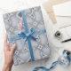 Ce papier d'emballage comporte un motif de tuiles extensibles de coeurs de fondu d'argent entourant un diamant central. Un excellent papier d'emballage pour les cadeaux d'anniversaire mariage et argent.