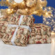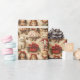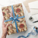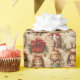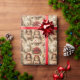 Très joli papier d'emballage avec poupées vintages mignonnes, chatons, rubans rouges, sucres de canne, paquets de noël, branches de pin et pinecones.