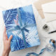Le papier d'emballage dans une copie du recouvrement en feuille de palmier silhouette, aux nuances du bleu, de la marine/de indigo, et du blanc de cobalt, sur un fond léger de bleu de ciel