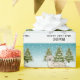 L'illustration originale de Destei d'un mignon chien de race Golden Retriever crème anglais. Le chien est placé dans une scène hivernale avec trois sapins verts. L'arrière - plan est un dégradé bleu à blanc qui donne un aspect froid d'hiver. Il y a une zone de texte personnalisable qui se lit maintenant : "Joyeux Noël !" avec un nom personnalisé.