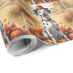 Un tableau aquarelle d'un chien gai assis au milieu d'un tas de feuilles d'automne vibrantes, entouré de minuscules citrouilles et de glands épars. Le chien porte un petit casquette pèlerin et des poutres de joie, capturant l'esprit de Thanksgiving. Dans l'arrière - plan, les champs de moissons et les arbres dorés créent une ambiance campagnarde paisible. Des textures douces et des tons d'automne chauds et feutrés confèrent à la scène une atmosphère cosy et nostalgique parfaite pour célébrer la beauté de la saison.