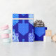 Ce design Hanoukka contemporain et lumineux présente des formes simples et des motifs complexes dans une palette classique bleu et blanc