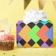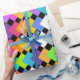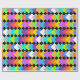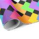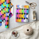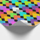 Ce papier d'emballage a une conception géométrique de diamants néons se chevauchant sur un champ de noir.