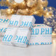 Document d’accompagnement de la partie de doctorat qui indique le nom du diplômé, le domaine d’études et la date de fin de diplôme. Cet article inclut le nom dans une police de script manuscrite et un dessin blanc et bleu. Ajoutez simplement les informations du diplômé, ajoutez ce papier d’emballage à votre panier, et laissez la fête commencer !