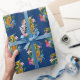 Un dragon chinois vert avec un koi orange avec fleurs de lotus et fleurs de cerisiers sur fond de bleu foncé.