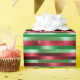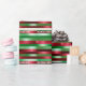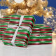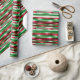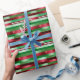 Ce papier d'emballage de Noël présente un design festif avec des rayures horizontales dans les couleurs traditionnelles de vacances de vert, rouge et blanc, rehaussé par un effet scintillant métallique qui ajoute un brillant élégant. La conception inclut du texte personnalisable, vous permettant d'ajouter des messages personnels comme "Joyeux Noël à [Nom] de [Expéditeur(s)]", qui se répète le long des bandes pour un look cohésif. L'effet chatoyant saisit la lumière magnifiquement, créant une présentation luxueuse et attrayante pour vos cadeaux. Ce papier d'emballage est parfait pour ajouter une touche personnalisée et éblouissante à vos cadeaux de Noël.