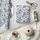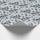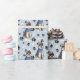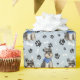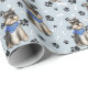 L'image d'un Chien miniature gris Schnauzer Terrier est la caractéristique du motif sur ce papier d'emballage cadeau toute occasion. Le chien porte une écharpe bleue et s'assoit au milieu d'un motif d'empreintes de pattes noirs et d'os blancs. L'image est répétée sur un arrière - plan bleu argenté.