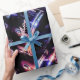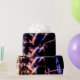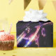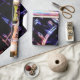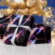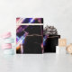 L'illustration sur ce papier d'emballage est une photographie originale d'un ensemble de tambour. Les tambours noirs brillants avec leurs jantes argentées reflètent les couleurs des lumières en le studio, les bleus, les rouge et les verts. Des cymbales au-dessus des tambours attendent pour être frappées.