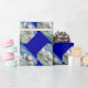 Ballon à air chaud aux couleurs arc-en-ciel, flottant parmi les nuages blancs et moelleux. L'image est perpendiculaire et ressemble à une carte postale apposée sur le papier avec des angles (c'est-à-dire que les coins sont coupés). L'arrière - plan bleu foncé est la base de la couleur du papier d'emballage.