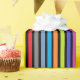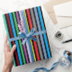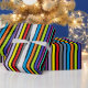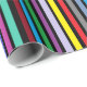 Emballage cadeau d'anniversaire avec des rayures rouges, bleues, violettes, vertes, orange, citron vert et jaune.
