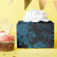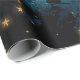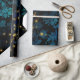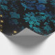 Papier d'emballage profond bleu, turquoise et violet damassé avec étoiles dorées lumineuses.