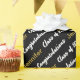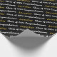 Ce papier d'emballage noir a un modèle de texte que vous pouvez modifier. Vous pouvez modifier le faux (pas de feuille) texte or pour montrer le nom de votre diplômé. Le texte blanc montre l'année où l'étudiant est diplômé (montré : Classe de 2024) et un message personnalisé (montré : Félicitations). Félicitations et Classe de 2024 sont dans un script élégant, mais le nom du diplômé n'est pas dans un script. Le texte forme un motif du papier d'emballage de graduation.