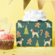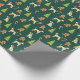 un papier d'emballage sur le thème de Noël avec un motif répétitif. Le motif est constitué de plusieurs éléments, dont des whippets portant des chapeaux de Père Noël rouges et des foulards rouges, des arbres de Noël verts décorés d'ornements rouges, des hommes en pain d'épice et des sucres de canne. La couleur arrière - plan du papier d'emballage est vert foncé, ce qui contraste agréablement avec les éléments colorés. Le design est festif et fantaisiste, ce qui le rend approprié pour envelopper les cadeaux de Noël, surtout pour les amoureux de les chiens ou ceux qui apprécient un thème de vacances ludique.