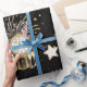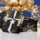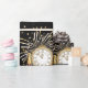Le soir du Nouvel An ou le jour de l'An enveloppé d'or sur le noir, avec une horloge prête à frapper minuit, champagne et cadeau. Offrez à vos invités de la fête ou à votre autre personne importante quelque chose de spécial pour célébrer l'année à venir. Parties scintillant or, noir, or.