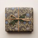 Les éléphants gris et bleus parmi les jaune filigree fleurissent contre un arrière - plan brun café.