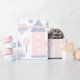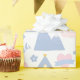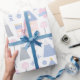 Ce joli papier d'emballage pastel pour filles présente un motif avec des châteaux roses, des lollipops, des coeurs et des montagnes bleues sur un arrière - plan blanc. C'est le papier d'emballage parfait pour un cadeau baby shower ou l'anniversaire d'un enfant.