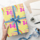 Papier d'emballage d'anniversaire dans un arc-en-ciel coloré avec étoiles et ciel jaune. Personnalisez ce papier d'anniversaire pour filles avec votre propre nom et âge 10 à 19. Lit actuellement Joyeux Anniversaire Kaitlyn 14 aujourd'hui. Parfait pour envelopper un cadeau spécial de 14e anniversaire. Uniquement conçu par Sarah Trett.