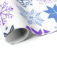 Ce papier d'emballage a une conception hivernale de différents flocons de neige dans le blues et les violets dans les rangées.