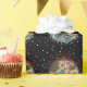 Ce papier d'emballage cadeau de Noël présente un graphique d'un ornement d'arbre rond avec un cadre photo personnalisé. Les mots "Joyeux Noël" entourent l'extérieur du cadre photo. L'arrière - plan est noir avec des points blancs qui représentent des flocons de neige. Photographie © Storytree Studios, Stanford, CA