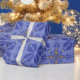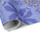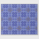 A blue wallpaper with a floral and geometric pattern in gold and darker blue, shown as partially unrolled and flat, conveying elegance and sophistication.