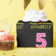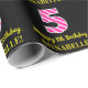 Cette conception amusante de papier d'emballage sur le thème de l'anniversaire comporte un grand nombre de "5" avec un motif à rayures rose clair et rose foncé, ainsi que le message "Joyeux 5e anniversaire", et un nom modifiable. L'arrière - plan est noir de couleur. Envelopper du papier comme celui-ci peut être une façon amusante d'envelopper un cadeau d'anniversaire ou un cadeau donné à quelqu'un qui célèbre son cinquième anniversaire. [~Z0000376]