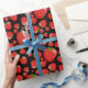Papier d'emballage de nouveauté de différentes tailles de fraises éparpillé au hasard sur un arrière - plan noir. Envelopper le cadeau parfait dans ce délicieux papier.