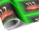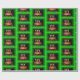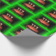Une photo d'un papier d'enveloppement de gâteau d'anniversaire qui est lumineux et coloré. Avec un cadre vert autour d'un gâteau avec trois bougies flambantes. C'est sur le papier d'emballage.