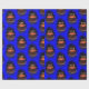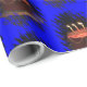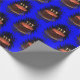 Une photo d'un papier d'enveloppement de gâteau d'anniversaire qui est lumineux et coloré. Avec un cadre bleu autour d'un gâteau avec trois bougies flambantes. C'est sur le papier d'emballage.
