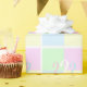 Le genre révèle du papier d'emballage de fête en bleu, rose, vert et jaune. Ponctuée d'un point d'interrogation blanc, bleu et rose.
