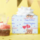 Un joli papier cadeau d'ours en peluche de 1er anniversaire pour un arrière-petit-fils avec un ours en peluche en aquarelle et des ballons cardiaques avec l'âge d'anniversaire. Le tout sur un pois bleu/ arrière - plan confetti Un design sucré pour un petit garçon qui aura un an. Ajoutez le nom et l'âge de l'enfant pour le customiser pour ce bébé spécial. Tout le texte peut être modifié au besoin pour customiser.