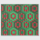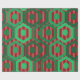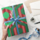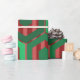 Ce papier d'emballage a un design géométrique d'hexagones dans quatre nuances de vert sur un champ de rayures dans deux nuances de rouge.