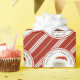 Répandez la joie de Noël avec ce papier d'emballage cadeau de vacances sur mesure et personnalisé avec un Père Noël très festif et guéri chantant HO HO HO. Décoré avec un classique de vacances de lignes diagonales rouges et blanches sur arrière - plan rouge, simulant des bandes de bonbons de menthe poivrée. Illustration originale de Suki's, tous droits réservés.