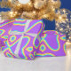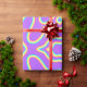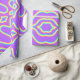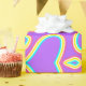 Un motif symétrique répété dans les tons violets, avec des contours jaune clair, bleu clair et turquoise clair créant un effet 3D. La palette de couleurs est vibrante et joyeuse, créant un visuel ludique et quelque peu fantaisiste. La répétition du design le rend apparemment infini.