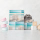 Une invitation de mariage avec des noms et une enveloppe personnalisés repose sur une plage de sable entourée de coquillages, d'une étoile de mer et d'un arrière - plan océanique turquoise. Les noms peuvent être modifiés ou supprimés.
