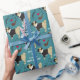 Un adorable carlin noir et bronzé porte une veste de smoking sur ce joli papier d'emballage d'anniversaire. À côté de lui, il y a des images d'une moustache, une paire de lunettes, une pipe et un coeur rouge. Le texte blanc dit "Tout habillé pour vous souhaiter un joyeux anniversaire". Les images et le texte sont placés sur un arrière - plan vert turquoise.