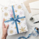 Ce joli emballage cadeau de Noël a un style classique avec un simple arrière - plan blanc. Cet élégant motif est orné de flocons de neige argentés et dorés et d'étoiles dorées. Papier d'emballage de Noël parfait pour toute la famille.