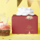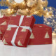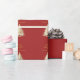 Un arrière - plan de couleur rouge. Décoré d'un arbre enneigé. Joyeux Noël est écrit avec un élégant script de style manuscrit. Personnalisez et ajoutez votre nom de famille. Texte doré.