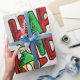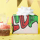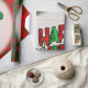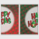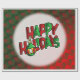 Cette image est un message qui dit "Joyeuses fêtes" en rouge et vert. Un ornement de Noël solitaire en vert, blanc, rouge et or est suspendu. Cela se fait sur un rond blanc opaque. L'image du coeur rouge et vert est carrelée comme un fond. Une bordure blanche a été ajoutée. Ce papier d'emballage est livré dans un assortiment de styles, de couleurs et de tailles.