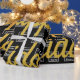 Le texte d'affichage large se lit « Joyeuses Fêtes » en écriture dorée factice. (Si vous le souhaitez, vous pouvez modifier le texte pour afficher un message personnalisé.) Remplacez le fichier du logo d'affichage par le logo de votre entreprise. Votre logo apparaîtra selon un motif sur du papier d'emballage noir.