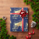 Une silhouette de cheval d'or avec des accents d'or sur le papier bleu d'emballage cadeau. Le texte indiquent le Joyeuses Fêtes.