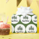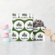 Ce rouleau de papier d'emballage de Noël présente un arrière - plan vert avec un motif composé de cercles blancs et de trois arbres à feuillage persistant. Le haut du cercle dit Joyeux jours fériés.