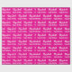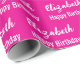 L'emballage d'anniversaire est rose-chaud. Il a un motif texte pour le nom du destinataire dans un script et la phrase Joyeux anniversaire. Le nom (Montré : Elizabeth) apparaît dans un script élégant. Le texte est blanc. Tout le texte peut être modifié.