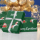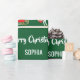 Enveloppement cadeau de Noël moderne pour les enfants, avec une licorne tirant Père Noël traîneau, le salut "Joyeux Noël" dans la typographie stylisée, et un nom personnalisé. Sur un arrière - plan vert de Noël.