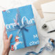 Cadeau de Noël moderne avec les mots "Joyeux Noël" dans la typographie stylisée, flocons de neige, illustration d'une licorne tirant Père Noël dans son traîneau, et un arbre de Noël. Sur un arrière - plan bleu avec des flocons de neige. Notez que vous pouvez personnaliser le petit salut avec le nom d'un enfant.