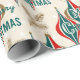 Ce charmant papier d'emballage présente un motif répétitif d'ornements de Noël classiques en rouge, vert et or, entrecoupés de fines branches d'aiguilles de pin. Les ornements rappellent une époque révolue, évoquant un sentiment de nostalgie et de joie de vivre intemporelle. L'arrière - plan est d'un beige doux et crémeux, donnant à l'ensemble un aspect vintage.