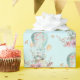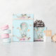 Papier enveloppant avec une charmante illustration d'un petit lapin chevauchant dans une montgolfière décorée d'un joli ruban rose, avec quelques fleurs et papillons. Un arrière - plan pastel bleu aquarelle lui donne une sensation de rêve vintage.