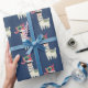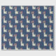 Papier d'emballage à motifs avec une illustration amusante. Un mignon lama portant des lunettes de soleil noires et un chapeau de santa rouge. Portant également une couverture de style sud-américain et des pom-poms. Le mot Joy écrit au-dessus de sa tête dans une police festive et colorée.
